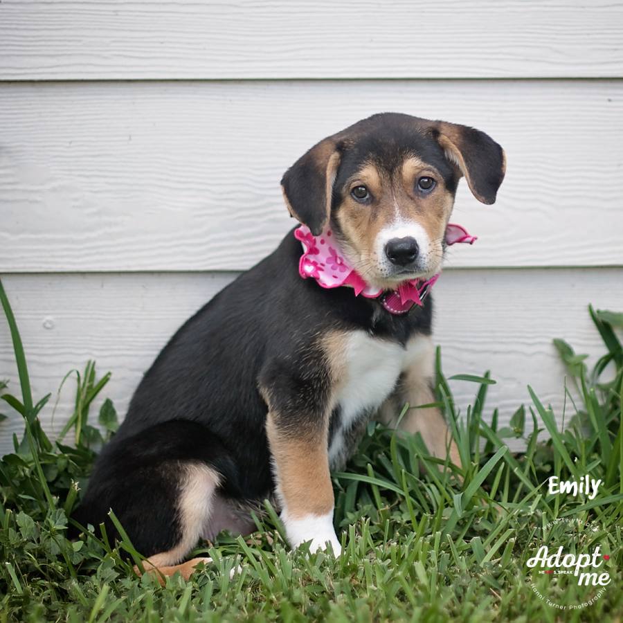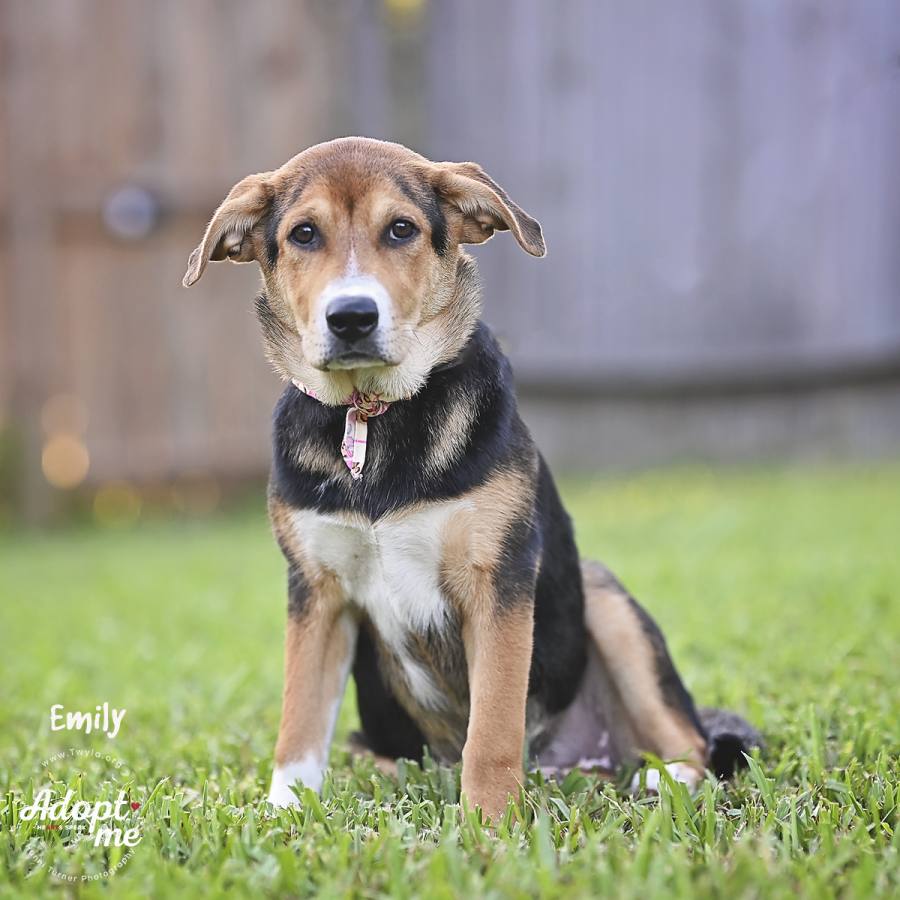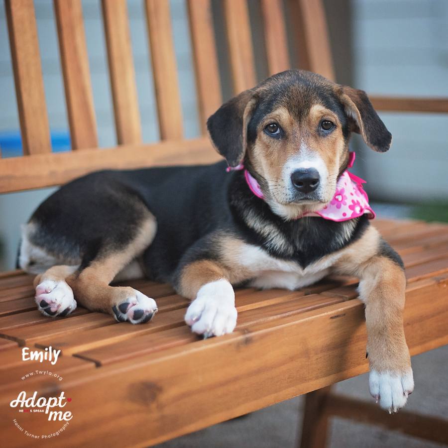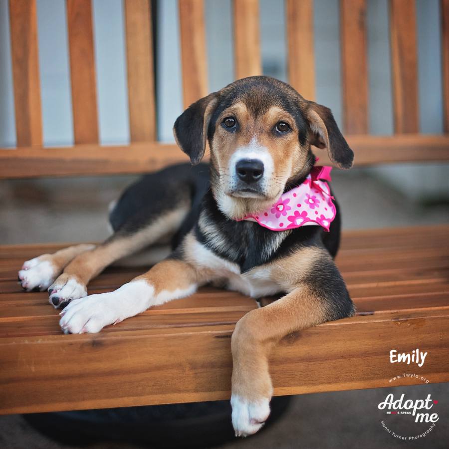 Emily is looking for a home with other dogs to help mentor her and play with her. Older kids may be OK  in a home with a large-breed experienced handler as these pups grow by leaps and bounds and don't know their size and strength yet.